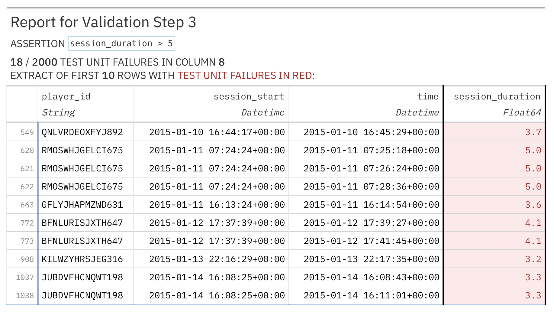 This report provides the 18 rows where the failure occurred. If you scroll the table to the right you’ll see the column that underwent testing (session_duration) is highlighted in red. All of these values are 5.0 or less, which is in violation of the assertion (in the header) that session_duration > 5.